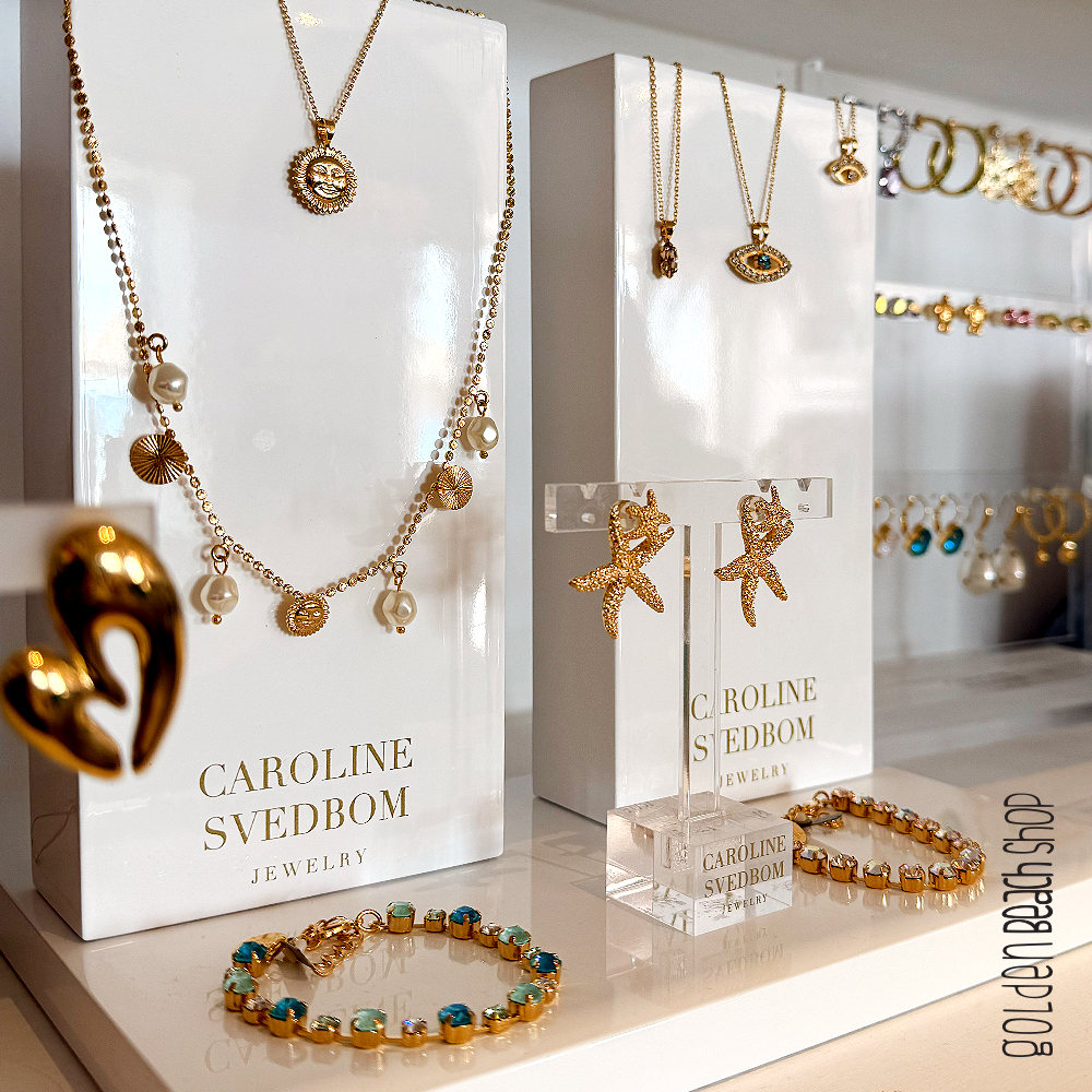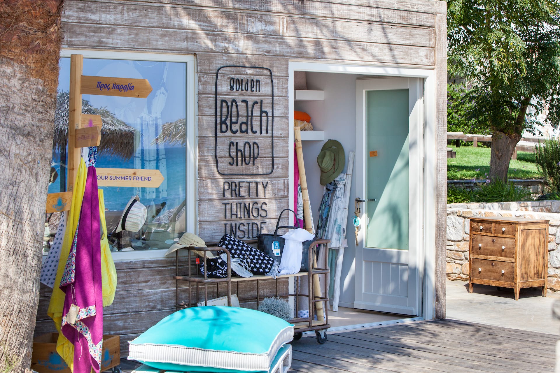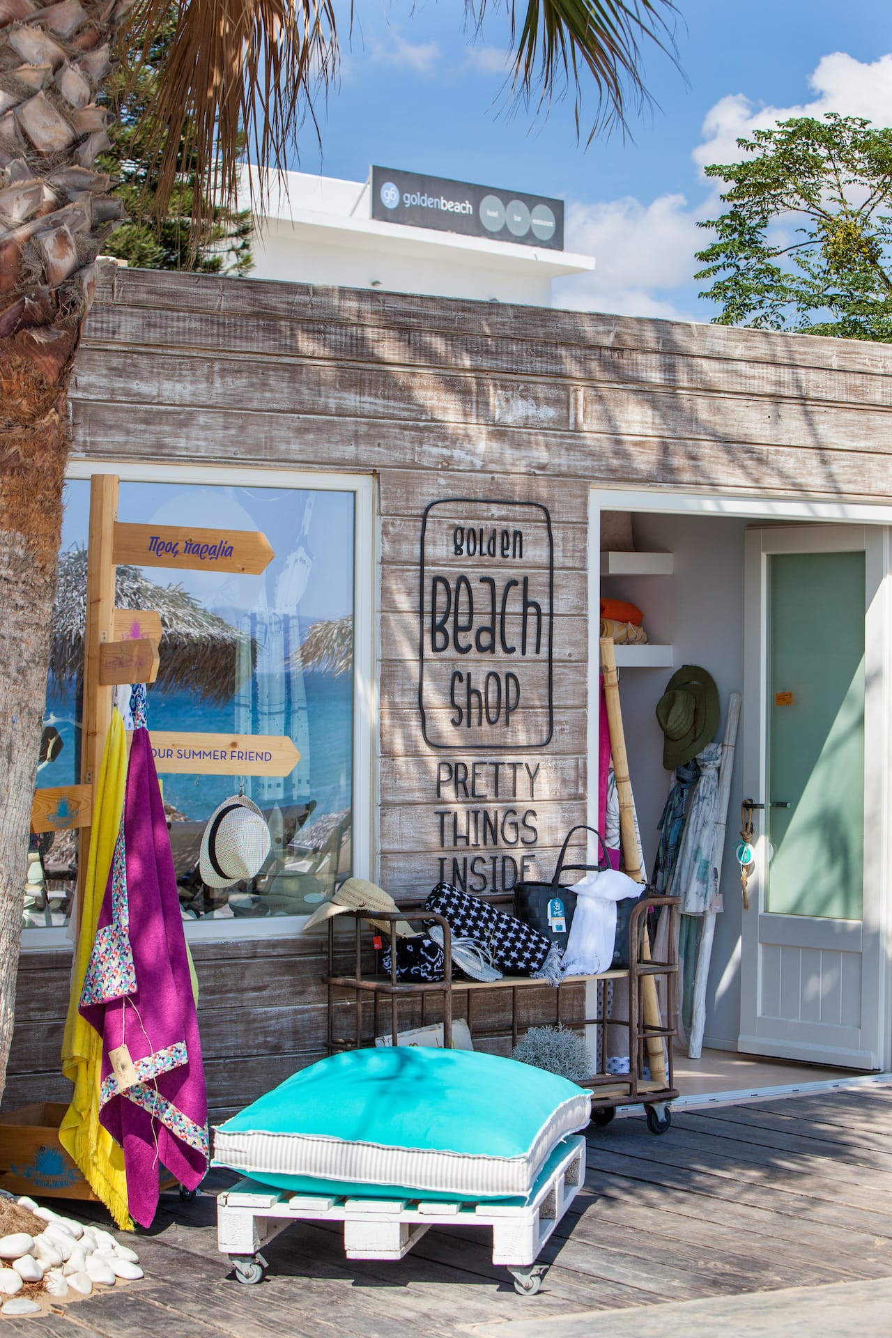 Golden beach shop features unique high-end items from the world over, focusing on beachwear, sunglasses, bags, sandals, swimwear, pareo towels and of course jewelry, often created by passionate Greek and international designers.