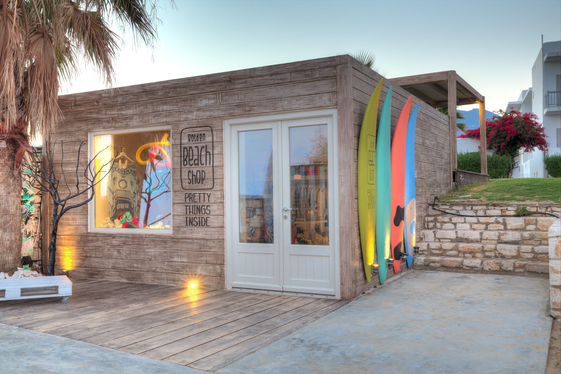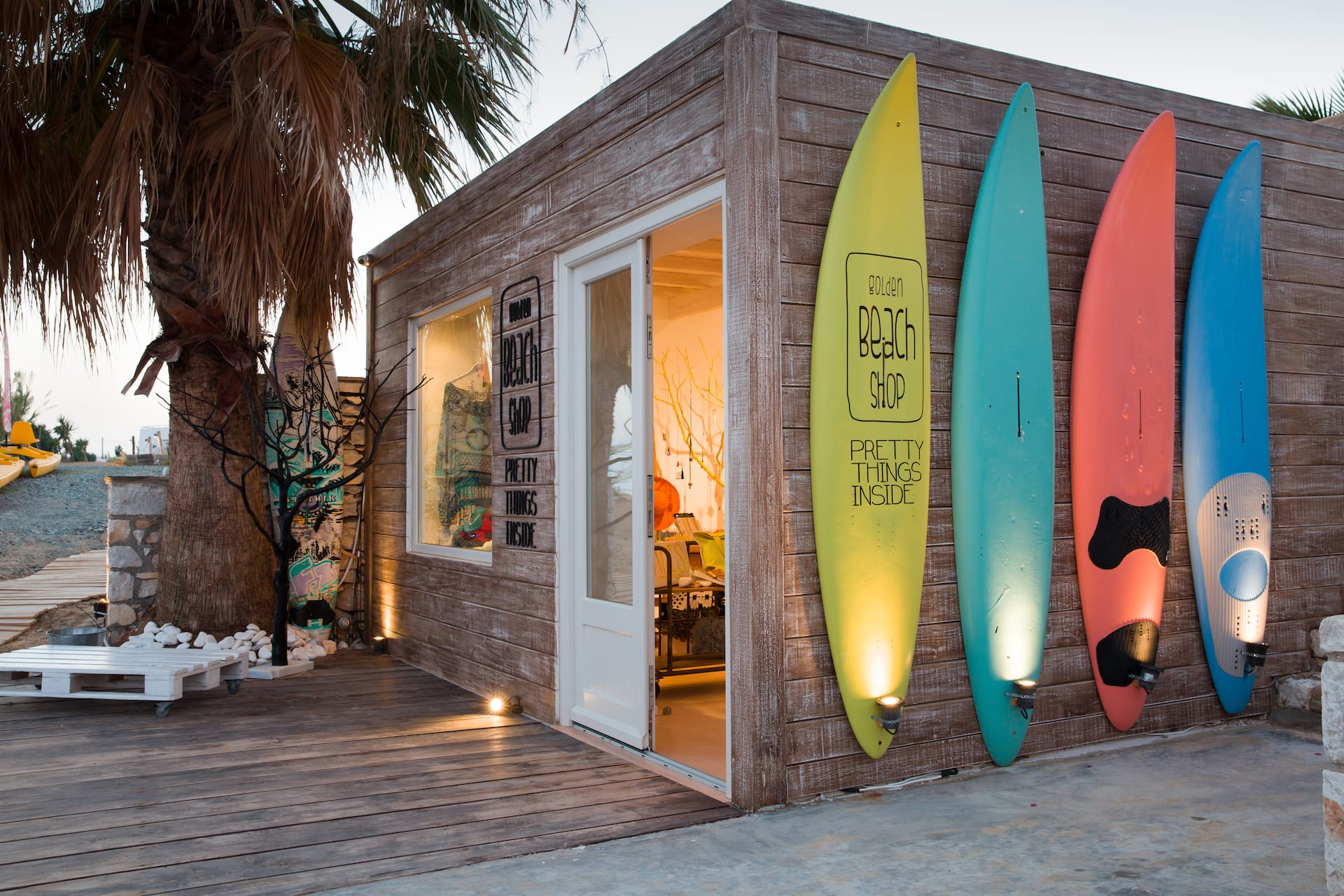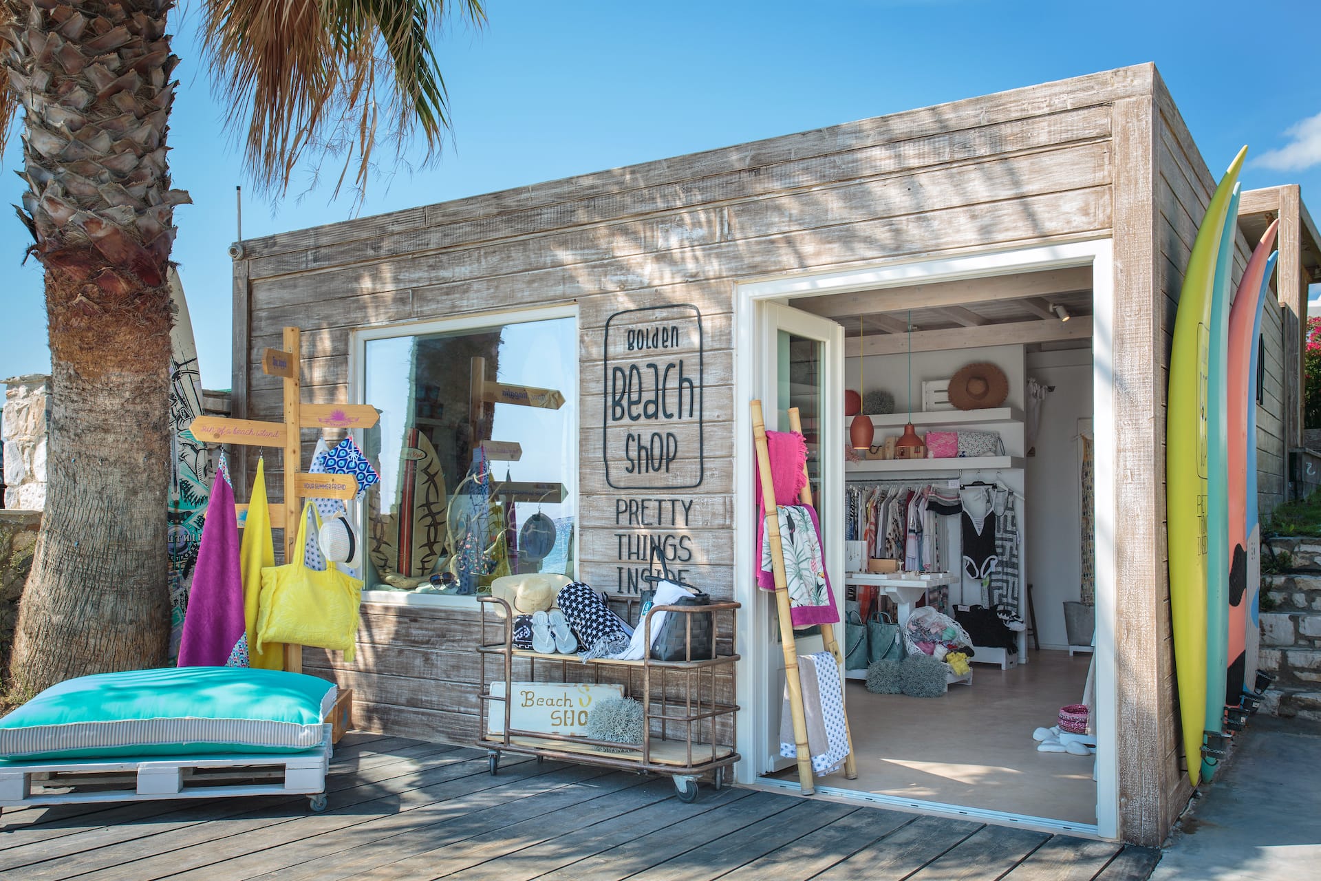 Golden beach shop features unique high-end items from the world over, focusing on beachwear, sunglasses, bags, sandals, swimwear, pareo towels and of course jewelry, often created by passionate Greek and international designers.